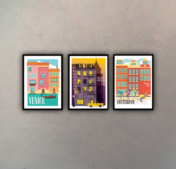 Set de reproducciones de afiches de diseño con motivos de ciudades.