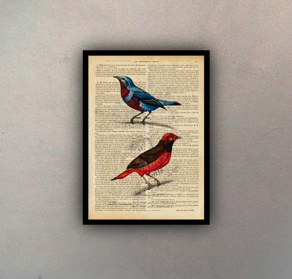 Atractiva reproducción de grabado antiguo con motivo aves a color sobre fondo de página de libro. Pieza de estilo vintage ideal para crear un foco de atención y originalidad en las paredes de tu casa. Imagen impresa en papel ilustración de alta calidad. Incluye vidrio de 2 mm.